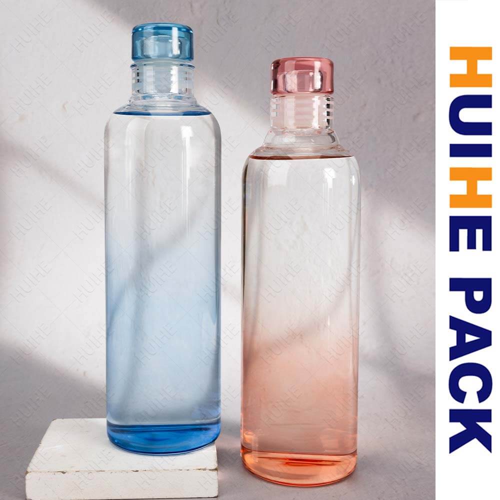 Questa bottiglia d'acqua in vetro borosilicato ha una forma cilindrica elegante e allungata, disponibile in finiture colorate sfumate (trasparente, blu, pesca, grigio scuro) che aggiungono un tocco moderno ed elegante. Il collo liscio si abbina a un cappuccio colorato abbinato per un look coerente.