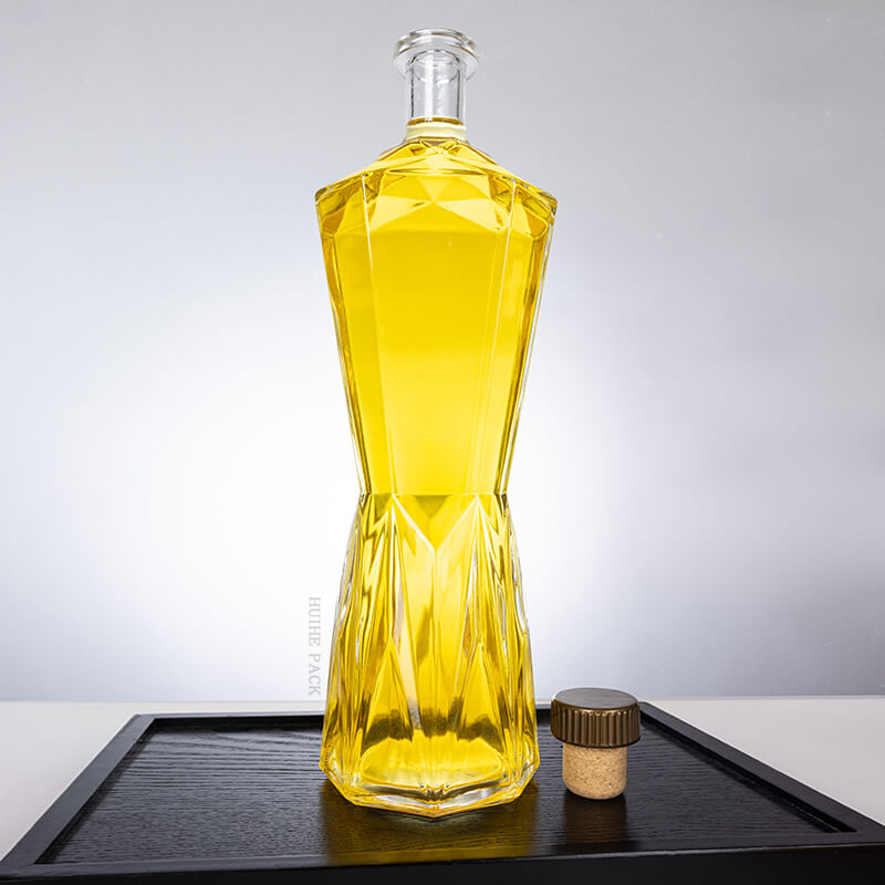 Questa bottiglia di liquore in vetro mette in mostra una silhouette scultorea e geometrica che trasuda eleganza. Il suo corpo è uno studio sull'arte angolare, con una sezione centrale ristretta che si esaurisce nella parte superiore e inferiore, creando una clessidra - simile alla forma. Le superfici sono adornate con tagli precisi e sfaccettati che catturano e rifrangono la luce, dando alla bottiglia un diamante, come lo splendore. Il collo corto e cilindrico si trova in cima alla parte superiore angolare, completando il profilo sorprendente. Per i marchi che desiderano 'scultura - bottiglie di liquori di vetro ispirate ' per fare una dichiarazione audace, questo design è una scelta straordinaria.