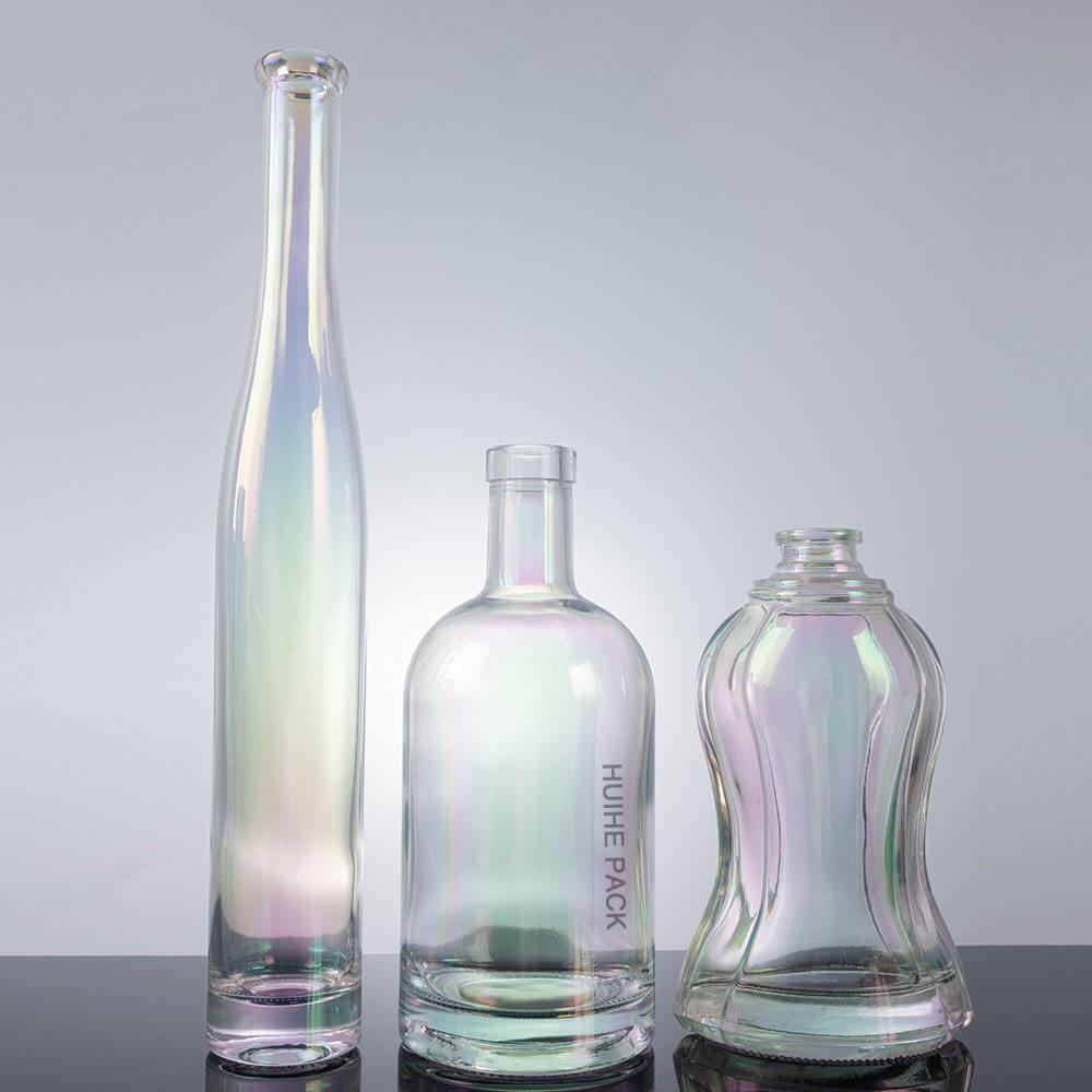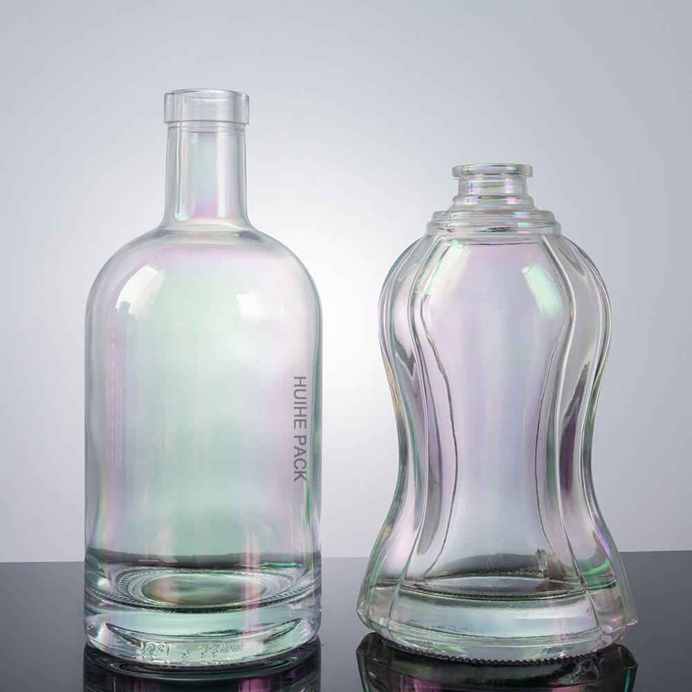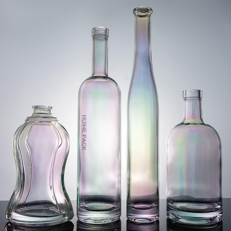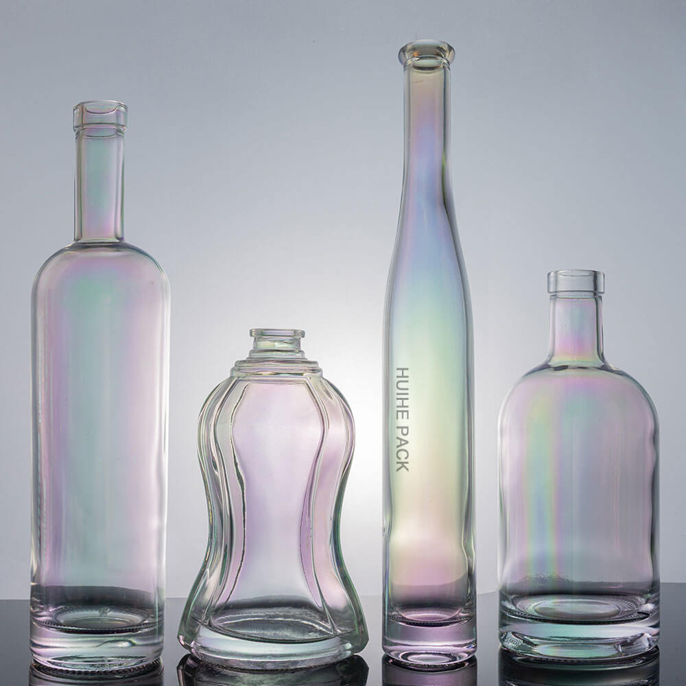 Queste bottiglie di liquore premium presentano un caratteristico rivestimento olografico che crea una lucentezza mutevole e iridescente sulle loro superfici, fondendo tenui tonalità pastello di rosa, viola e verde per un effetto lussuoso e accattivante. La collezione comprende una gamma di silhouette classiche, da una bottiglia sinuosa e scolpita a un collo alto e sottile, offrendo opzioni versatili per liquori, liquori e liquori artigianali di prima qualità.