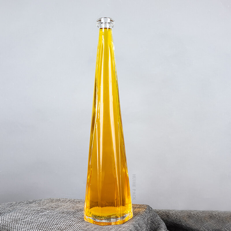 Questa bottiglia di liquore in vetro mostra una silhouette sorprendente e minimalista. Ha un corpo alto e snello che si assottiglia delicatamente dalla base al collo, formando una piramide elegante e allungata - simile a una forma. Le linee pulite e rette e il vetro trasparente gli danno un aspetto contemporaneo e sofisticato, rendendolo una tela perfetta per gli spiriti premium da distinguersi. Se visualizzato su uno scaffale a barre o utilizzato come regalo, la sua forma unica aggiunge un tocco di eleganza moderna.