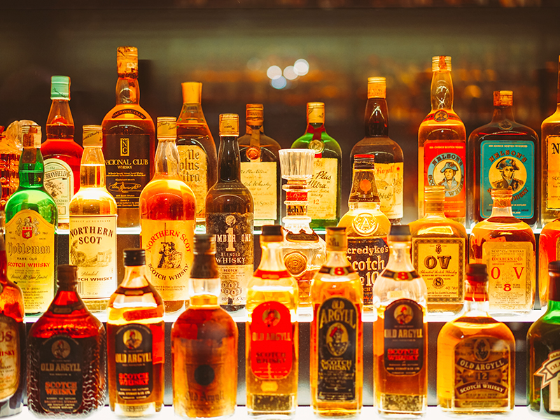 Il whisky è suddiviso in: Scotch whisky (Lo scotch whisky è suddiviso in: serie Macallan; serie Glenfiddich; serie Johnnie Walker; serie Ballantine's; serie Chivas Regal; serie Glenmorangie; serie Matthias, whisky americano, whisky canadese, whisky irlandese.